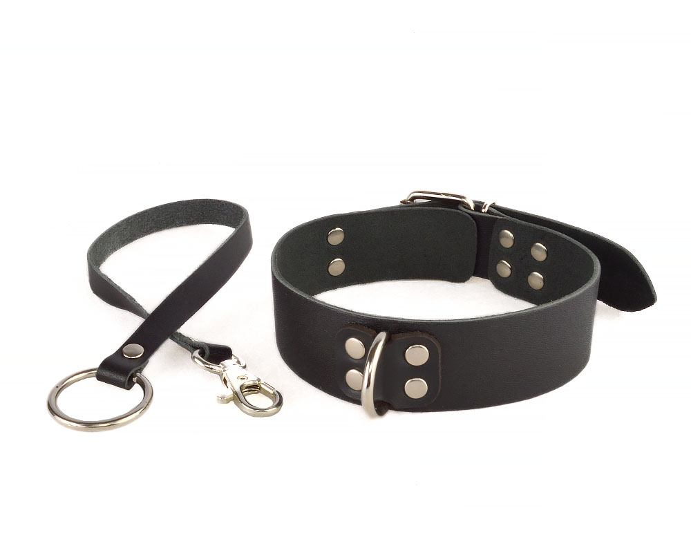 Ошейник изготовлен из натуральной кожи черного цвета. Поводок в виде кожаной ленты с карабином с одной стороны и колечком с другой. Регулируется при помощи пряжки.
