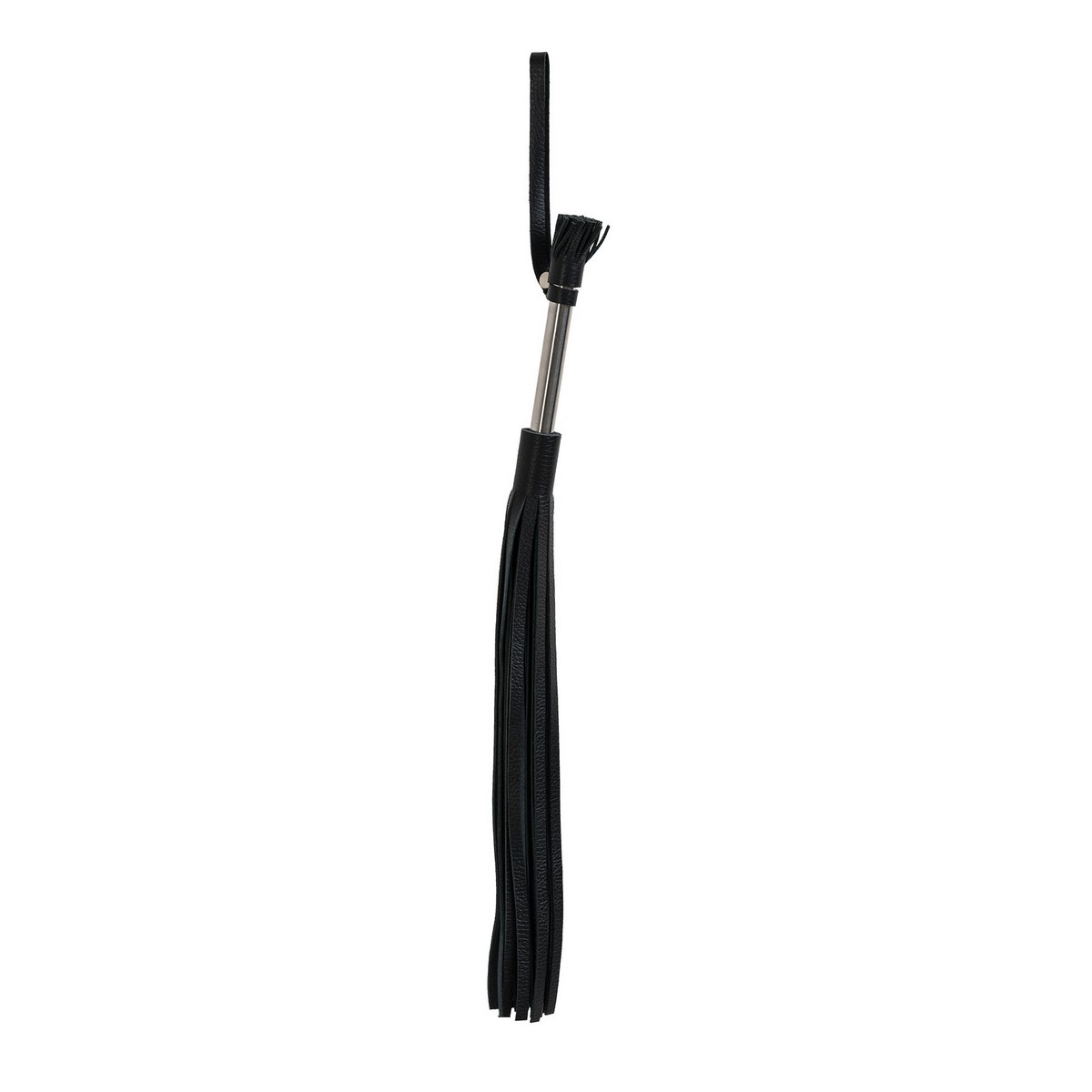 Аккуратная черная плеть из натуральной кожи с ручкой из медицинской стали , украшенная декоративной кисточкой. Имеется петля для удобного использования девайса.